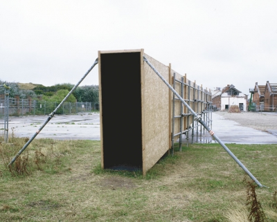 Zeezicht (Point de vue II), Zeedijk, Tongeren, 2005, 240 x 120 x 1400 cm.. scaffolding, fibreboard, black paint